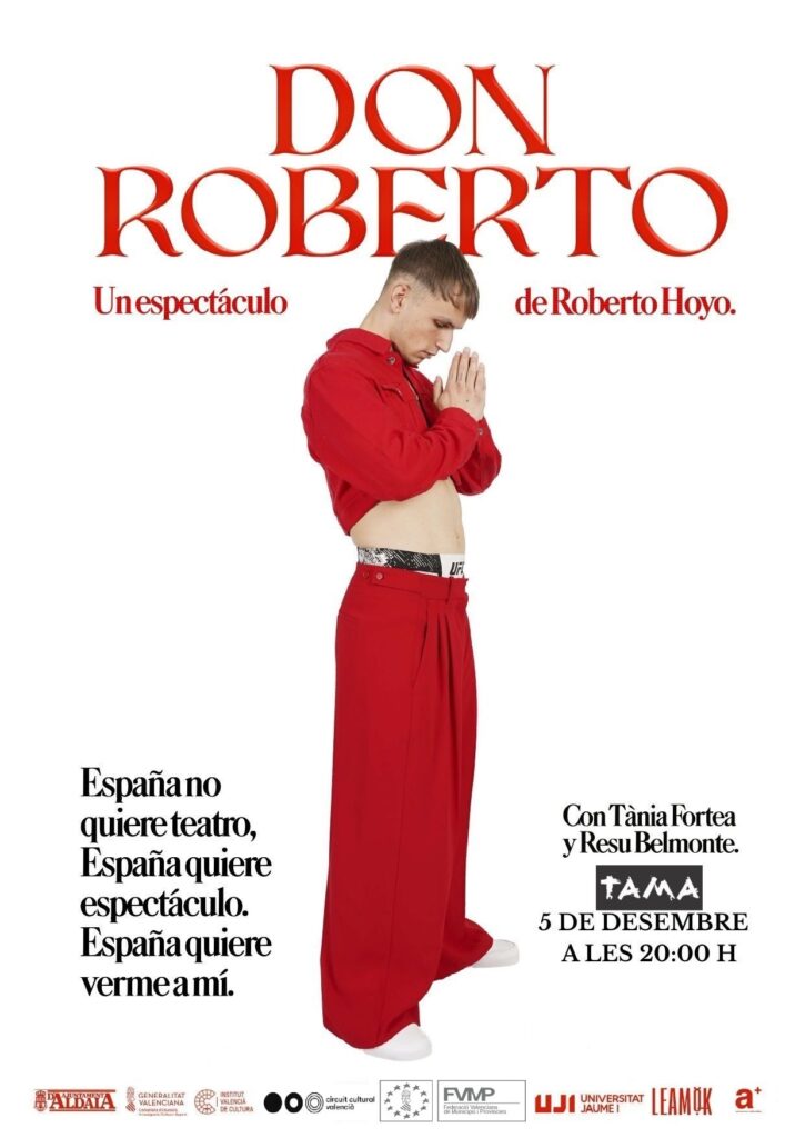 De nou Roberto Hoyo ens presenta al TAMA la seua obra, i en van tres, inspirada en els clàssics. “Don Roberto” de la cia Leamok (València) es recrea en una lliure, frívola i actual versió de “D. Juan”. L’autor ens diu “os voy a contar una historia: voy a hacer lo que me dé la gana y voy a conseguir todo lo que quiero porque soy el mejor en lo mío”. A les 20 hores.