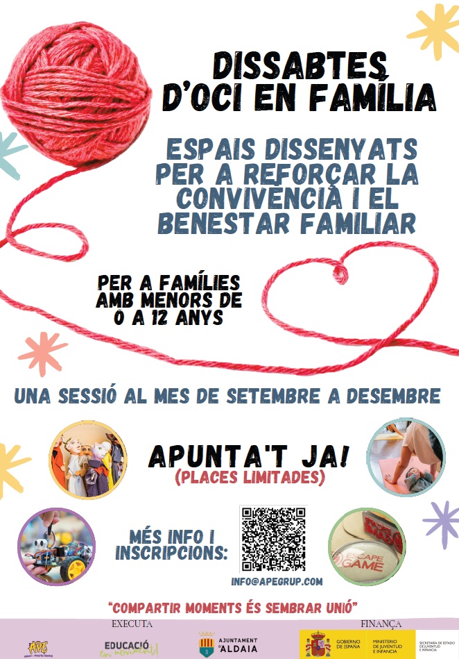 Aldaia presenta el projecte d’oci familiar, amb l’objectiu d’oferir activitats per a promoure la convivència, l’aprenentatge i el disfrutar en família. Es du a terme gràcies a la subvenció rebuda per este Ajuntament del Ministeri de Joventut i Infància, regulada en l’Ordre JUI/119/2025, de 6 de febrer, per la qual es regula la concessió de subvencions en l’àmbit de la infància, l’adolescència i la joventut, a les entitats locals afectades per la DANA entre el 28 d’octubre i el 4 de novembre de 2024.