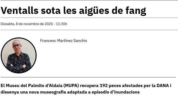 «Ventalls sota les aigües de fang» es el título del artículo que Francesc Martínez Sanchis ha publicado en la revista Bisagra. El director del MUPA hace un repaso no solo a los daños causados por la riada del 29 de octubre de 2024 en el ambit de la Cultura, sino que expone con detalle como la catástrofe afectó el MUPA y qué ha sido el proceso de recuperación. Cómo él mismo declara » La Cultura es un bien esencial que merece el apoyo más apresurado de las administraciones públicas en la reconstrucción».