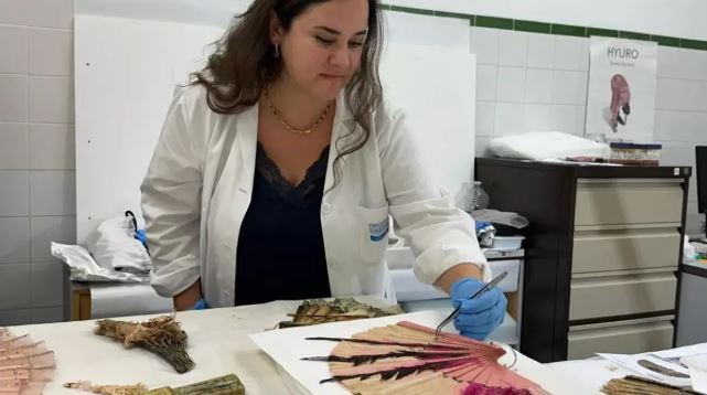 En segon lloc, s’ha dut un lot de 65 palmitos amb varetatges danyats a Abanicos Blay Villa d’Aldaia, taller de palmiters especialitzat en ventalls de nacre i tot tipus de varetatges elaborats amb materials nobles, així com en la restauració de palmitos històrics. Els treballs de restauració s’han centrat en la reparació i reconstrucció de varetatges trencats. Aquests 65 palmitos ja estan restaurats.